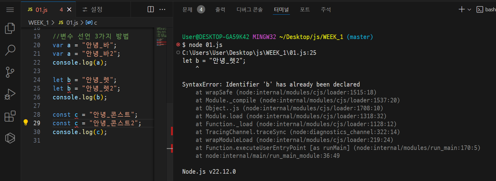 let , const 는 같은 이름의 변수를 또 선언하면 오류가 발생한다.