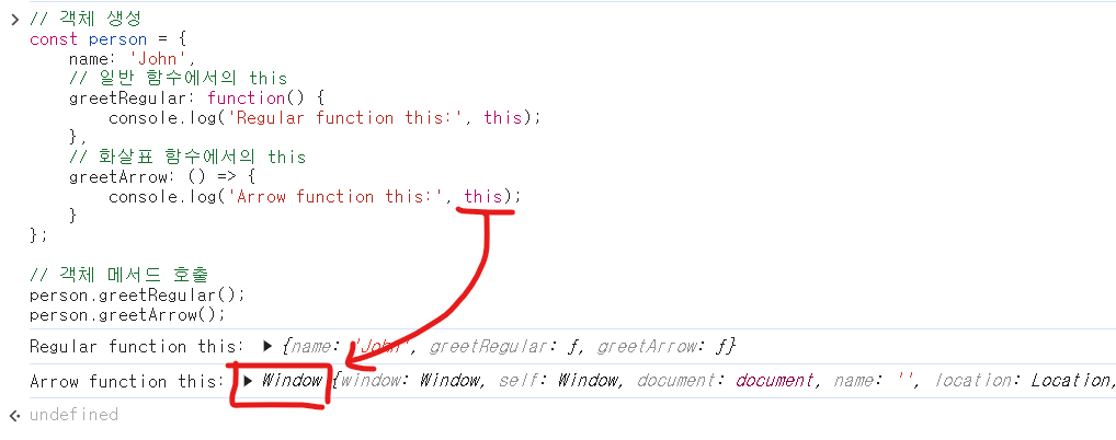 - 이친구는 ES6에서 나왔다. 아~무 거도 따르지 않고 자기 마음대로 호출시 바로 window를 가르키는것을 명심하자