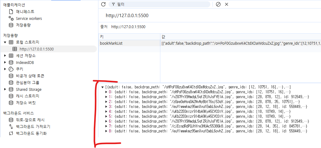 개발자도구 > 애플리케이션 > 로컬 스토리지에 들어가면 키와 값으로 구분되어 저장되는것을 확인할 수 있다.