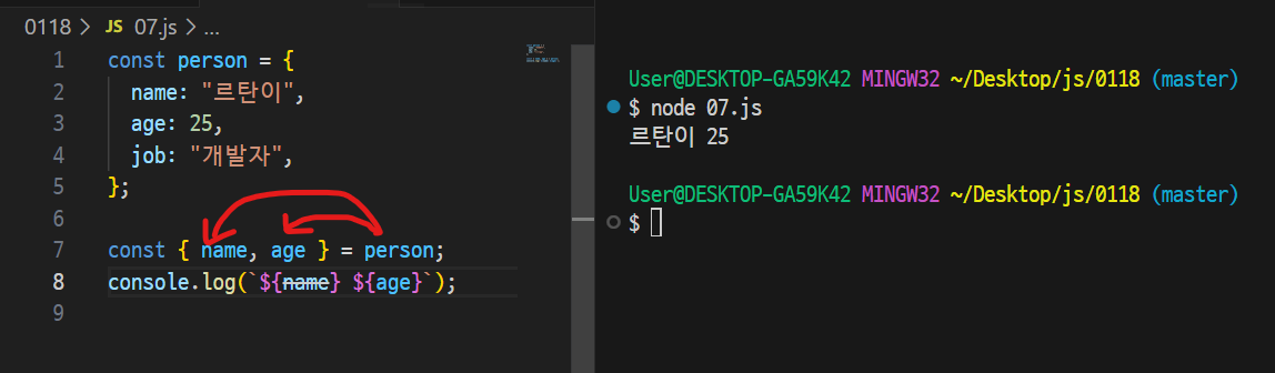 자바스크립트 객체에서 name과 age를 디스트럭쳐링을 사용하여 추출하고 출력 하였다.