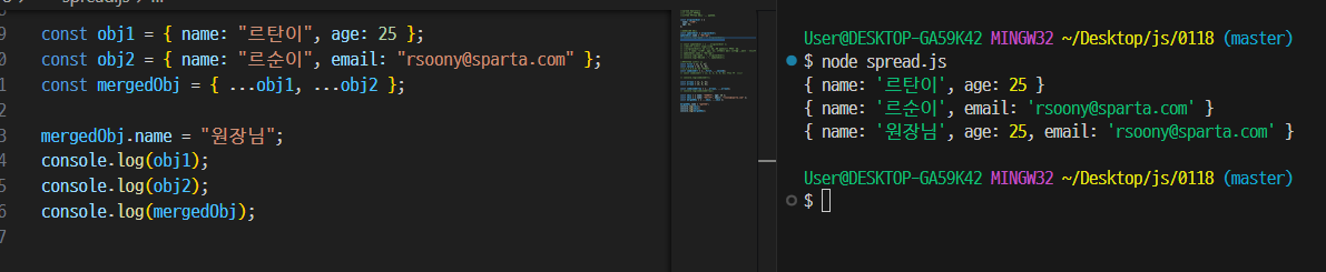 - 단, 같은 이름의 키가 존재할 경우 obj2의 값이 우선하여 반영되어야 합니다. 또한, mergedObj에서 name 속성의 값을 **'원장님'**으로 변경 후, 원본 객체 obj1과 obj2가 변경되지 않는 것을 확인하세요.
