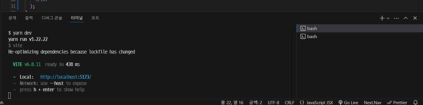 이렇게 터미널 창을 2개로 해서 작업하면 편하다(하나는 미리보기 서버용)