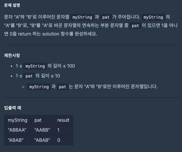 return [...myString].map((s) => s === 'A' ? 'B' : 'A').join('').includes(pat) ? 1 : 0;